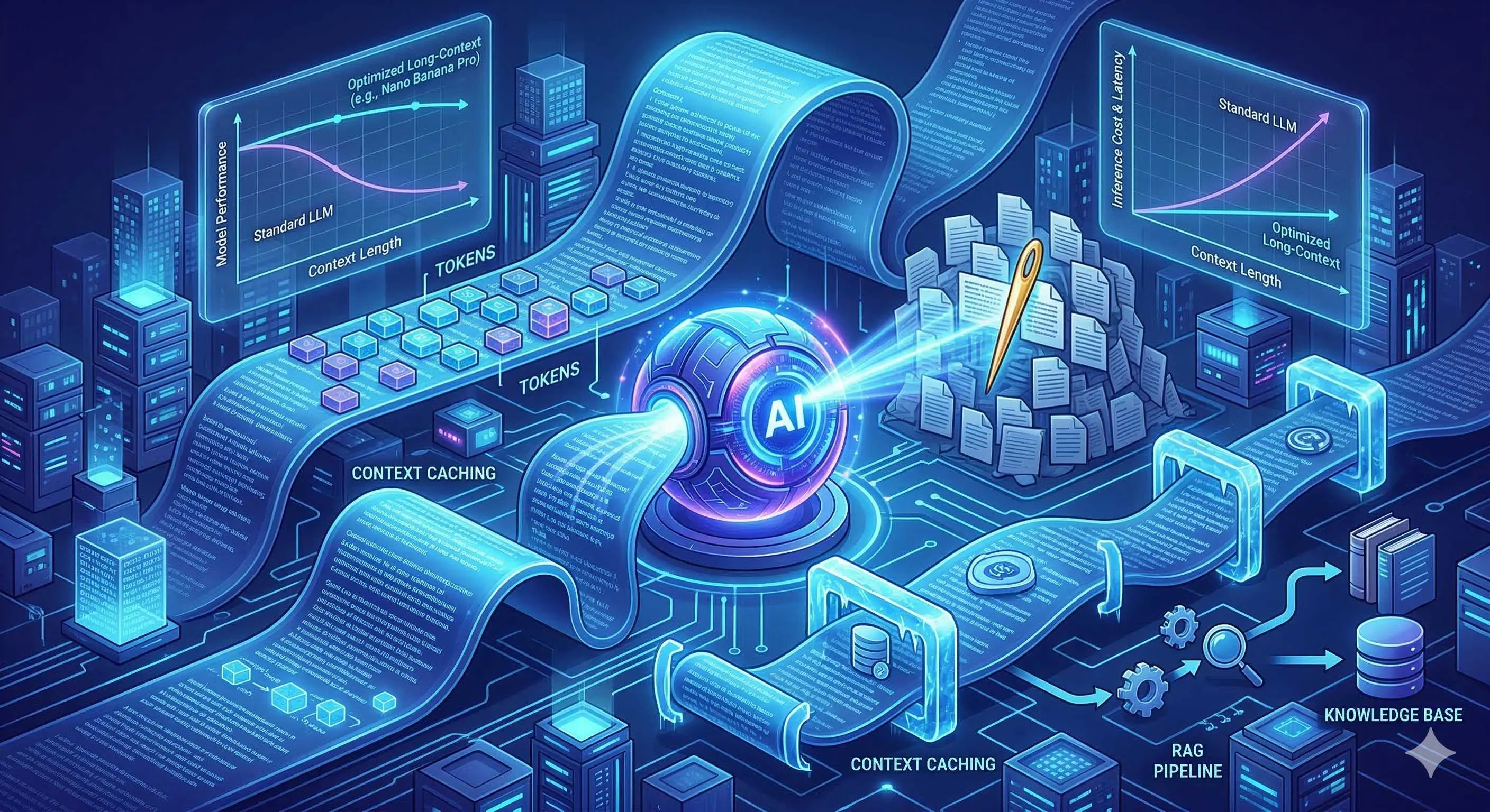 混合架构结合两者优势:第一层用向量检索(RAG)从海量文档中粗筛出最相关的几百篇,第二层把这批文档塞进Gemini长上下文进行深度分析。这样既有RAG的可扩展性,又保留了长上下文的理解深度,适合200万Token以上的文档集。